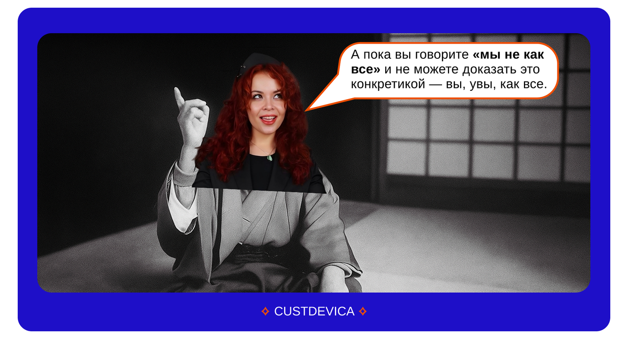 Любимая фраза фаундеров — «мы не как все». Но если дать им несколько секунд и попросить объяснить, в чём отличие — в ответ тишина. Или набор общих слов: «качество», «сервис», «подход к клиенту».